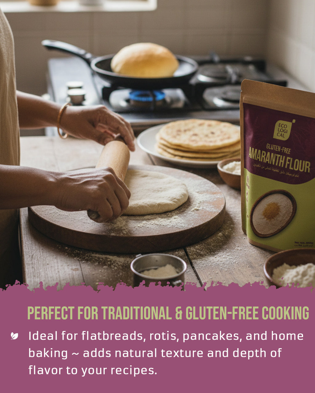 Whether you’re preparing flatbreads and rotis, baking muffins and cookies, or thickening soups and sauces, this amaranth flour enhances your dishes — without additives or preservatives.