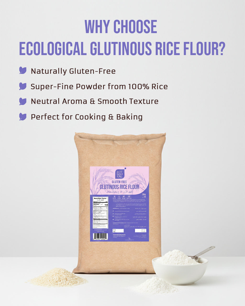 Ecological Gluten-Free Glutinous Rice Flour is a super-fine flour produced from glutinous white rice, milled to deliver a smooth texture and naturally neutral aroma. Known for its soft and chewy results, it is ideal for traditional recipes, desserts, and specialty baking applications.