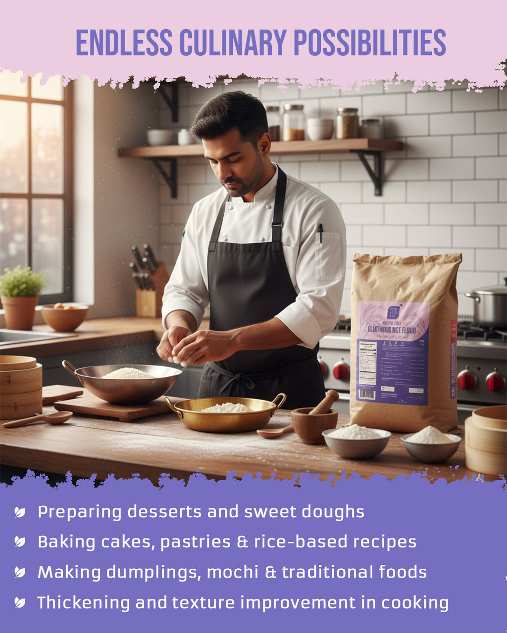 Naturally gluten-free and finely milled, this flour is widely used in sweet doughs, rice-based pastries, and recipes that require enhanced elasticity and texture. Its bright white color and consistent performance make it a reliable ingredient for both home and professional kitchens.