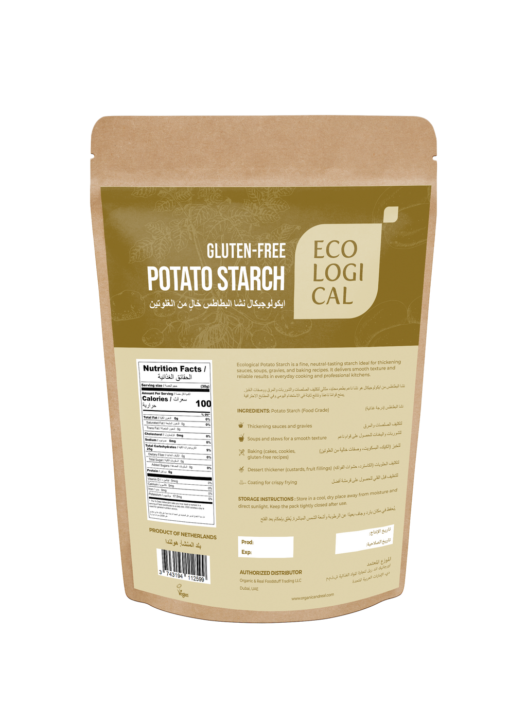 Ecological Gluten-Free Potato Starch is a fine, neutral-tasting starch carefully processed for smooth and reliable results in everyday cooking and baking. Known for its excellent thickening ability, it is ideal for enhancing texture and consistency across a wide range of recipes.