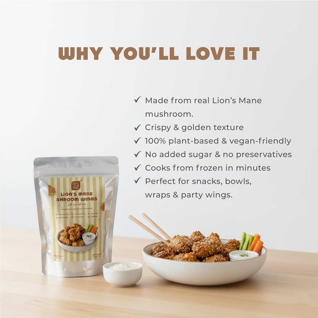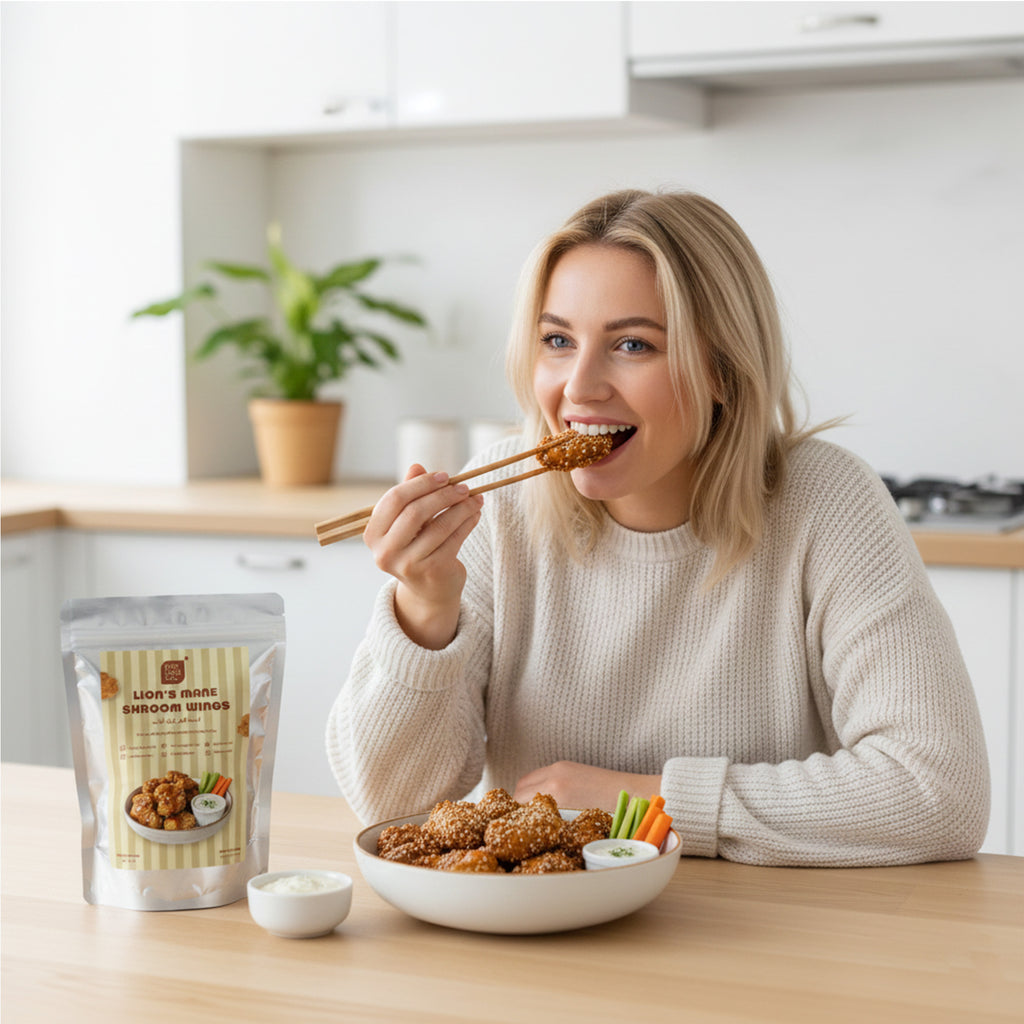Ecological Lion’s Mane Shroom Wings are handcrafted, crispy plant-based wings made from premium Lion’s Mane mushrooms, celebrated for their naturally meaty, fibrous texture. Each piece cooks straight from frozen into a golden, flavour-rich bite that delivers the indulgent feel of wings — without the meat.
