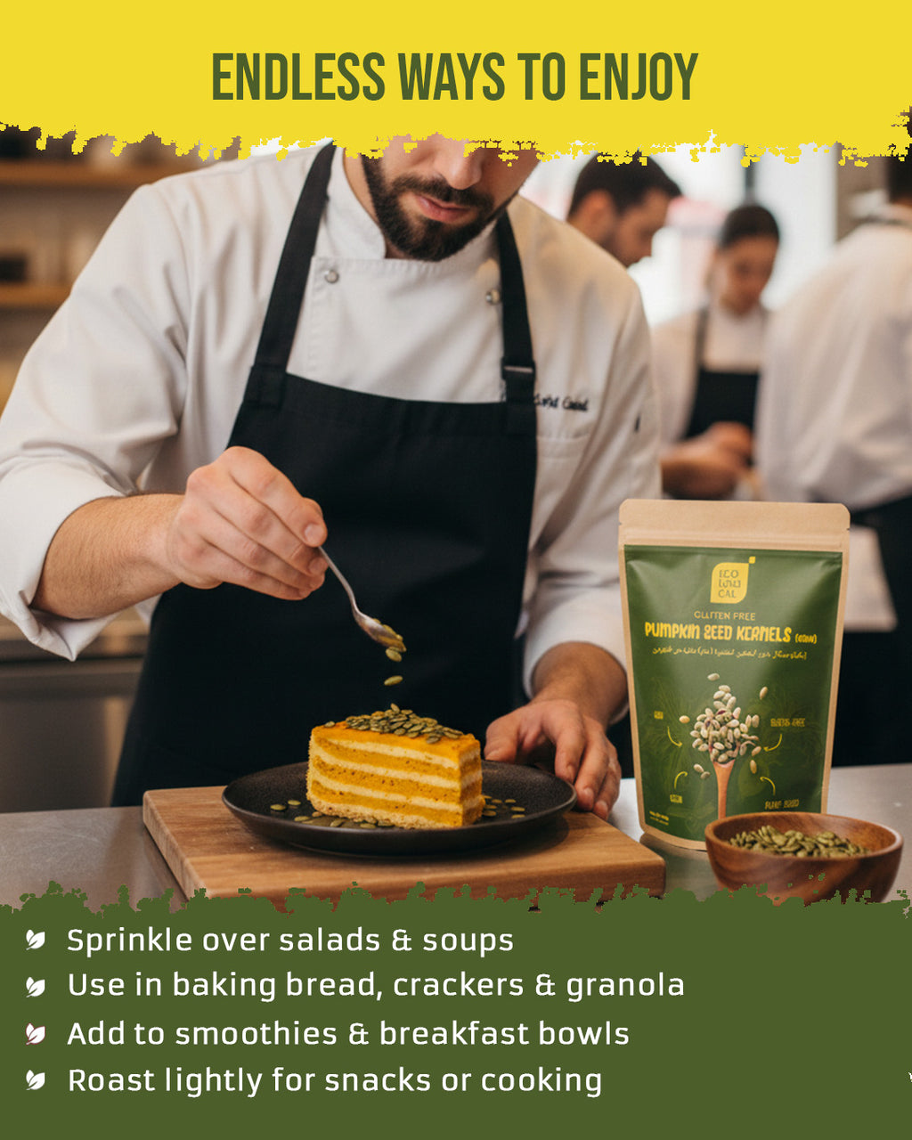 Naturally gluten-free, raw, vegan, and plant-based, our pumpkin seed kernels are ideal for those seeking clean, simple ingredients. With a mild, nutty taste and satisfying crunch, they blend seamlessly into a wide variety of sweet and savory dishes.